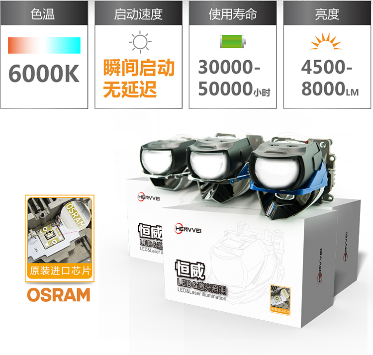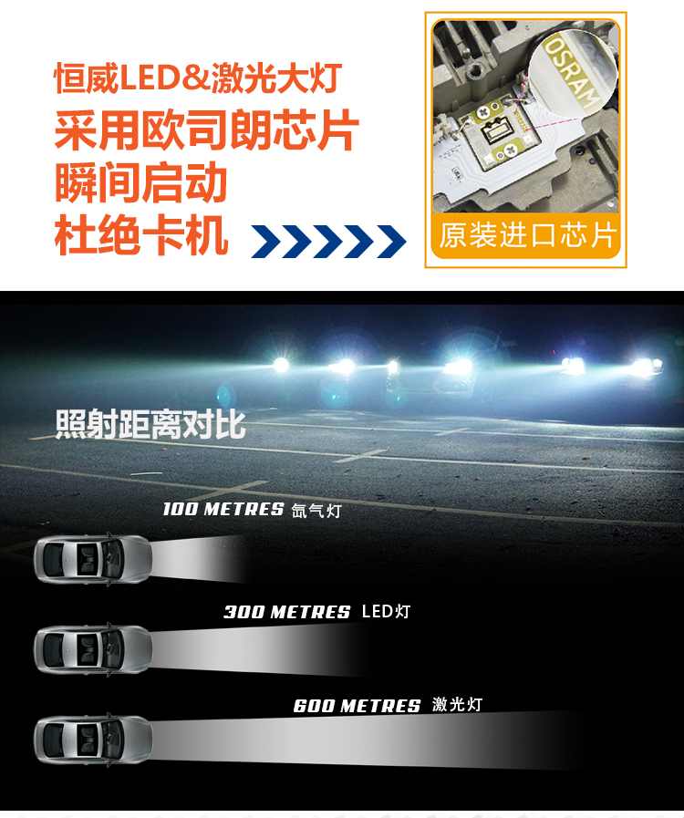 恒威LED&激光大灯 精选最高标准进口欧司朗光源配件 ,只为一个放心产品 ,同样我们海海改选择产品也是精挑细选 只做高品质的产品 选择好产品 靠谱稳定性好 。